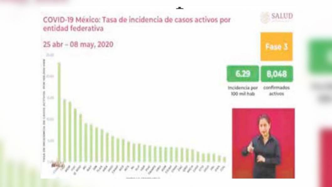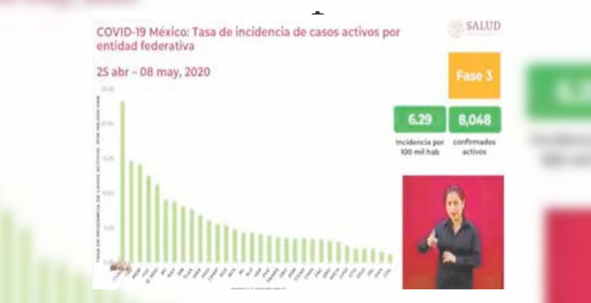 Se mantiene Morelos en el tercer sitio por tasa de incidencia de contagios por coronavirus, y en sexto sitio por contagiados activos por lugar de residencia, en la semana del 25 de abril al 8 de mayo, de acuerdo a la información proporcionada por la Secretaría de Salud federal. En México se tienen registrados 31 mil 522 casos acumulados de COVID-19 y tres mil 160 defunciones, confirmó ayer viernes el director general de epidemiología, José Luis Alomía Zegarra.