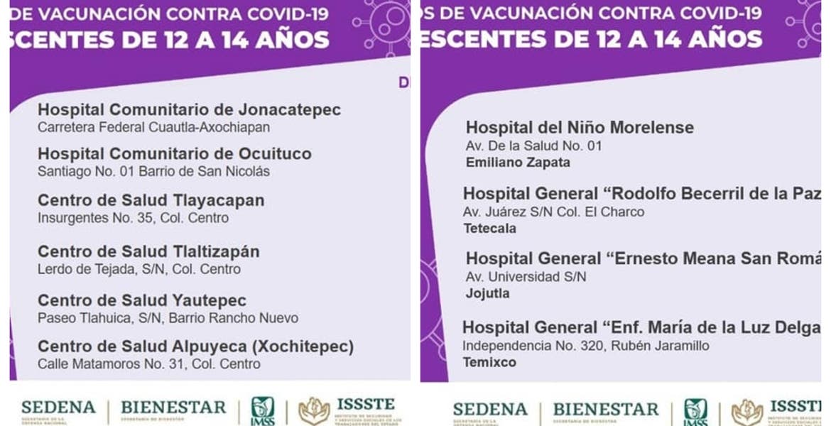 También, estarán disponibles en los centros de salud de Tlayacapan, calle Insurgentes, número 35, colonia Centro; en Tlaltizapán, ubicado en calle Lerdo de Tejada, sin número, colonia Centro; también en Yautepec, Paseo Tlahuica, sin número, Barrio Rancho Nuevo; y la unidad de Alpuyeca, con domicilio en calle Matamoros, número 31, colonia Centro, en Xochitepec.