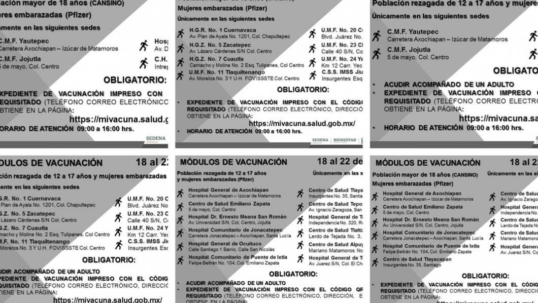 De este lunes 18 al viernes 22 de julio, continúa en Morelos la vacunación contra COVID19 en la población rezagada en 12 a 17 años y mujeres embarazadas con dosis de Pfizer, así como la aplicación de Cansino en rezagados mayores de 18 años.