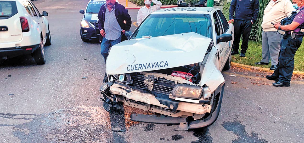 Cuernavaca.- Por no respetar la luz roja del semáforo, un taxi Tsuru y un Aveo blanco chocaron en el cruce de la avenida Teopanzolco y Calzada de los Estrada de la colonia Vista Hermosa, la mañana del lunes. El Aveo iba hacia el norte por Teopanzolco y el auto de alquiler circulaba por la Calzada.