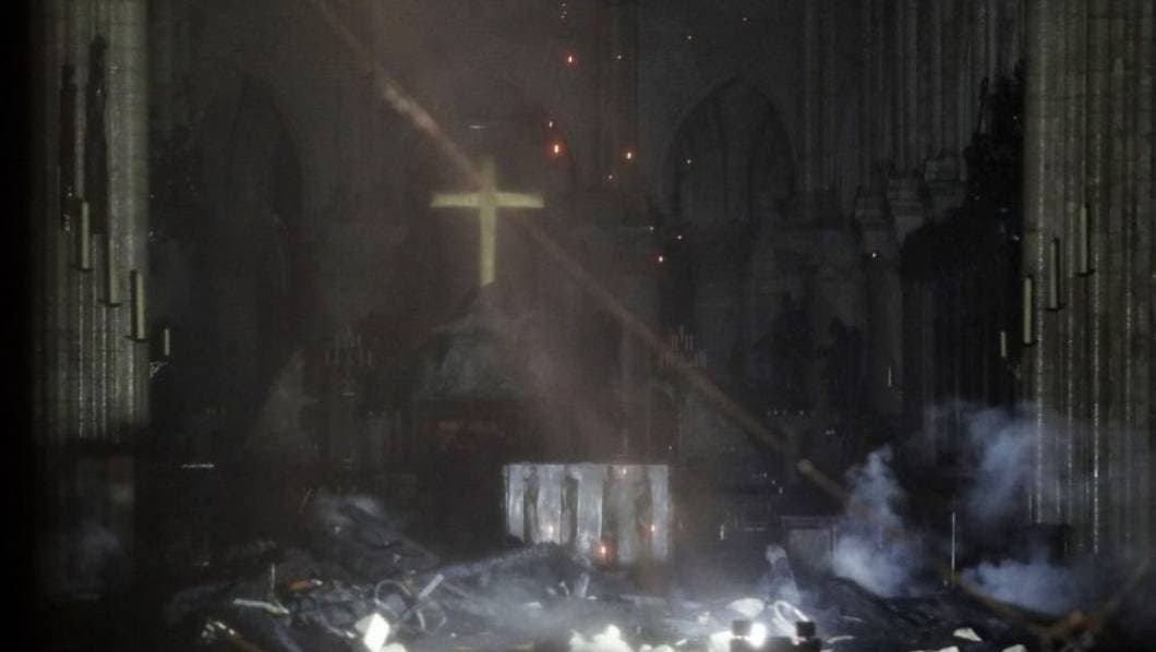 Entre los escombros, humo, cenizas y fuego, la cruz principal de Notre Dame esta intacta e iluminada al igual que el altar dejando a todos asombrados.
