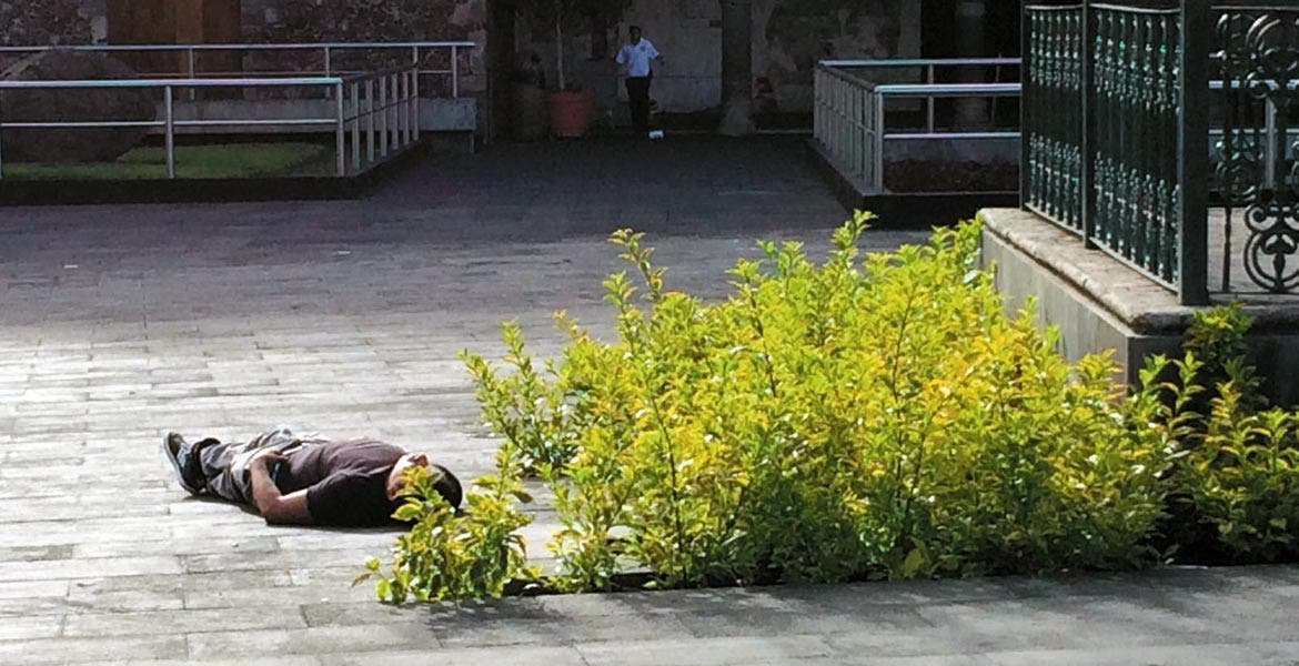 Tremenda sorpresa se llevaron transeúntes frente al Museo Regional Cuauhnáhuac, pues en el adoquín se topaban con un hombre en el suelo. Parecía que había sufrido algún incidente, pero en realidad sólo descansaba un poco.