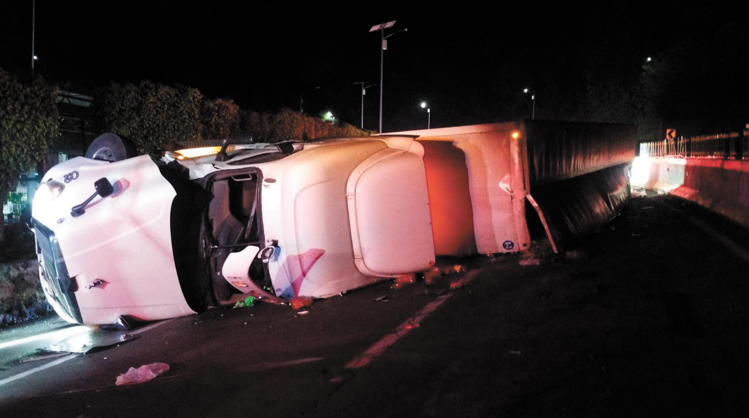 La pesada unidad que transportaba refrescos volcó sobre su costado izquierdo ya que, según el reporte de la Guardia Nacional (GN), el chofer perdió el control porque no disminuyó su velocidad al llegar a la curva y eso ocasionó que el peso de la carga venciera el remolque.