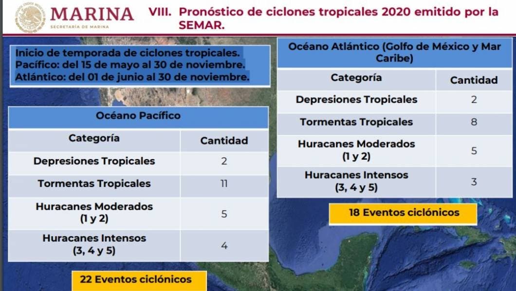 La secretaría de Marina (Semar) pronosticó una activa temporada de eventos ciclónicos para este 2020. Según el pronóstico habrá alrededor de 40 eventos, entre depresiones tropicales, tormentas tropicales y huracanes. De éstos últimos se prevén unos 17, de moderados a fuertes.