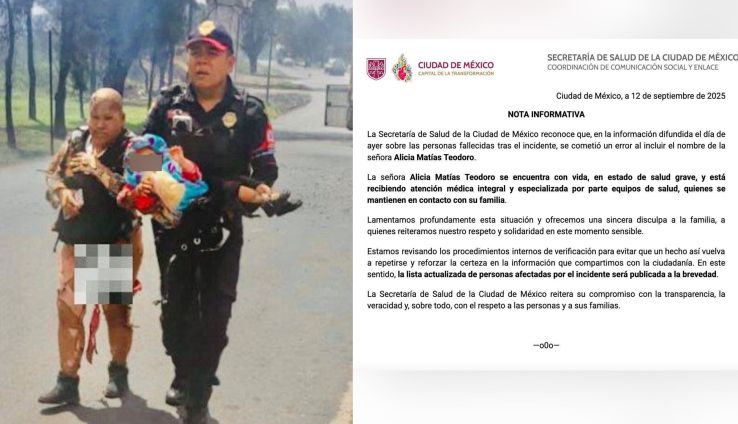En el comunicado, la dependencia aclaró que el nombre de Alicia Matías Teodoro fue incluido por equivocación en el listado de víctimas mortales. Precisó que la señora se encuentra con vida, aunque en estado de salud grave, y actualmente recibe atención médica especializada.