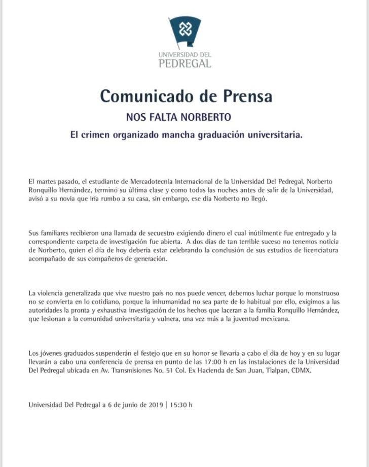 Norberto tendría que estar celebrando su graduación en la Universidad del Pedregal @U_Del_P, en la #CDMX, pero 2 días antes fue secuestrado. El rector, sus compañeros y familiares cambiaron la fiesta por una protesta, exigen que aparezca vivo #NosFaltaNorberto pic.twitter.com/UKViY6wnBy