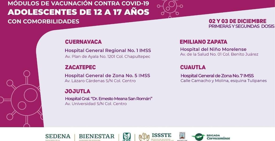 En Cuautla, la unidad disponible será en el Hospital General de Zona, número 7 del IMSS, calle Camacho y Molina, esquina Tulipanes. Para este sector con comorbilidades, padres de familia y/o tutores pueden ingresar a la liga http://vacunacovid.gob.mx/.../vacuna-covid19-adolescentes/, para consultar la información.
