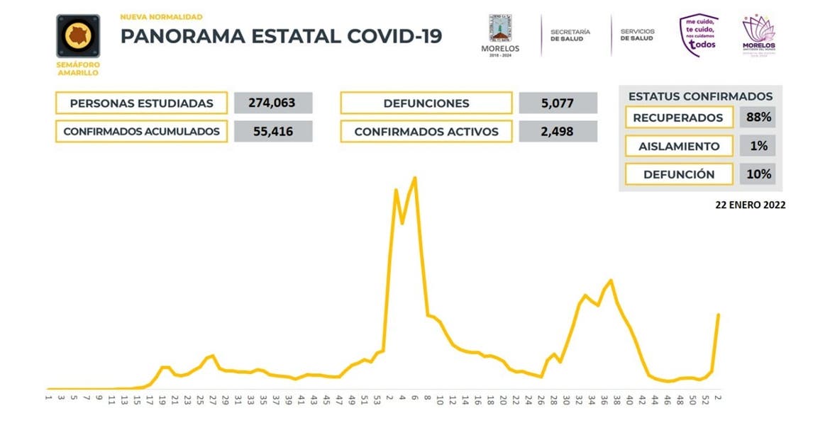 La Secretaría de Salud informa que a la fecha en Morelos se han estudiado 274 mil 063 personas, de las cuales se han confirmado 55 mil 416 con coronavirus COVID-19; 2 mil 498 están activas y se han registrado 5 mil 077 defunciones.