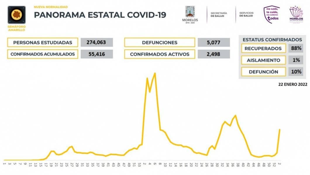 La Secretaría de Salud informa que a la fecha en Morelos se han estudiado 274 mil 063 personas, de las cuales se han confirmado 55 mil 416 con coronavirus COVID-19; 2 mil 498 están activas y se han registrado 5 mil 077 defunciones.