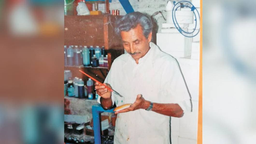 El maestro ceramista don Otilio Sánchez Medrano trabajando en su taller.