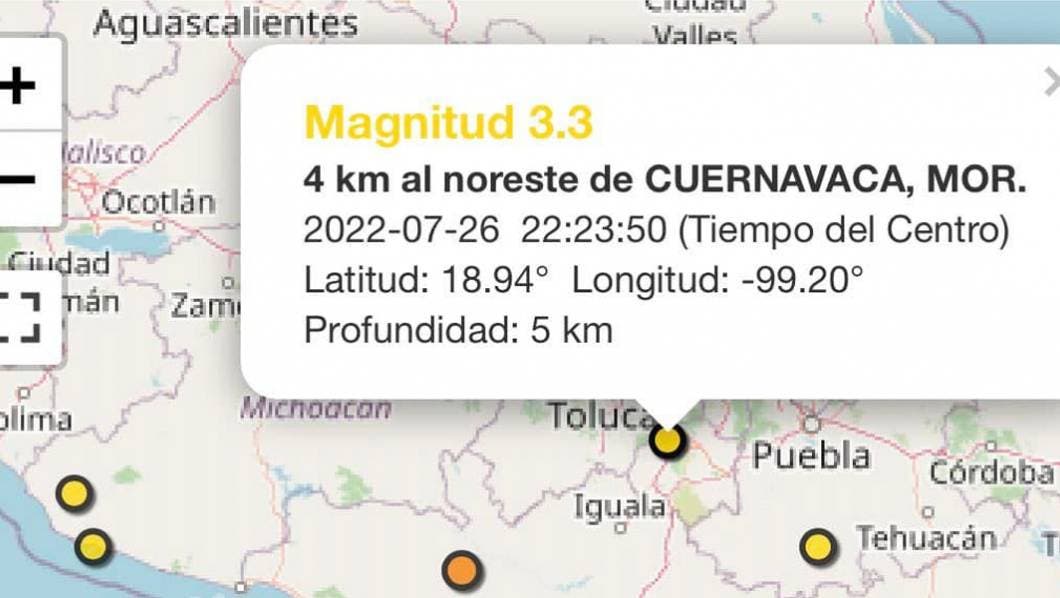 La Coordinación Estatal de Protección Civil Morelos (CEPCM), informa que siendo las 22:23 horas de este martes, el Servicio Sismológico Nacional dio a conocer un sismo de magnitud 3.3 grados, con epicentro al Noreste de Cuernavaca, por lo cual, fue percibido en algunas áreas de la zona metropolitana.