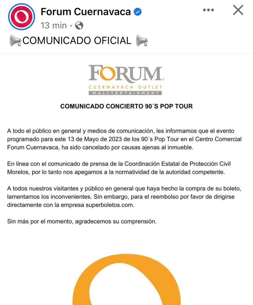 Luego de que se anunciara oficialmente la cancelación del concierto 90's Pop Tour, que se realizaría este sábado, tanto la cuenta oficial del evento, como la plaza comercial donde se realizaría, indican el procedimiento que se deberá seguir para obtener la devolución del dinero de los boletos.