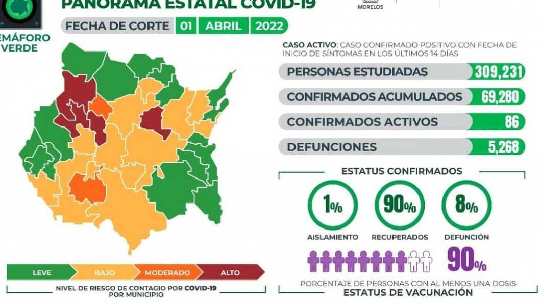 La Secretaría de Salud Morelos informa que a la fecha en Morelos se han estudiado 309 mil 231 personas, de las cuales se han confirmado 69 mil 280 con coronavirus COVID-19; 86 están activas y se han registrado 5 mil 268 defunciones.