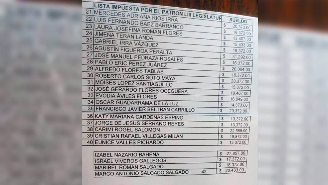 Y, los terceros mejor beneficiados son la hija de la ex diputada Silvia Irra Marín, Mercedes Adriana Ríos Irra; el recomendado de Éder Rodríguez Casillas, Roberto Carlos Soto Maya; y el hermano de la aliancista Edith Beltrán Carrillo, Francisco Javier, con los mismos apellidos, con un ingreso de 20 mil 372 pesos.