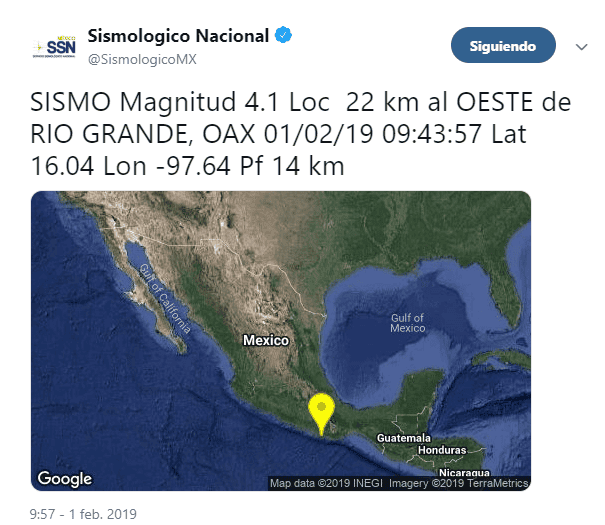 Poco antes, a las 9:43 de la mañana, se registró otro sismo de magnitud 4.1 con epicentro 22 kilómetro al oeste de Río Grande, Oaxaca.