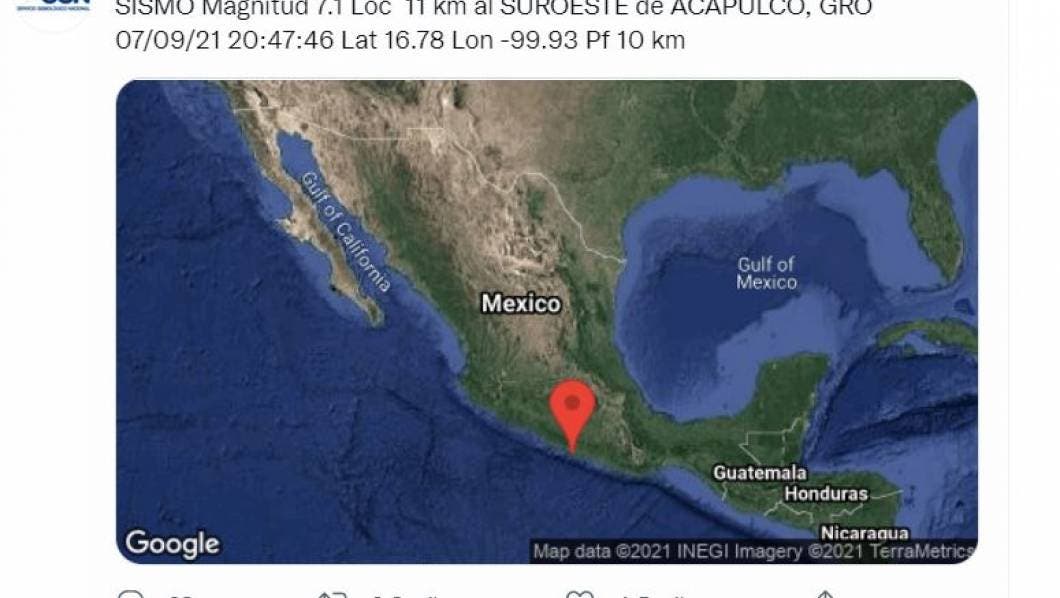 SISMO Magnitud 7.1 Loc 11 km al SUROESTE de ACAPULCO, GRO 07/09/21 20:47:46 Lat 16.78 Lon -99.93 Pf 10 km pic.twitter.com/EEogjshqW9