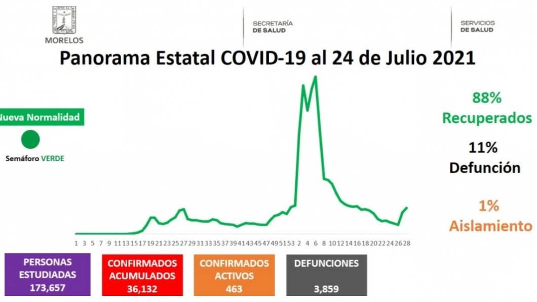 La Secretaría de Salud informa que a la fecha en Morelos se han estudiado 173 mil 657 personas, de las cuales se han confirmado 36 mil 132 con coronavirus COVID-19; 463 están activas y se han registrado 3 mil 859 defunciones.