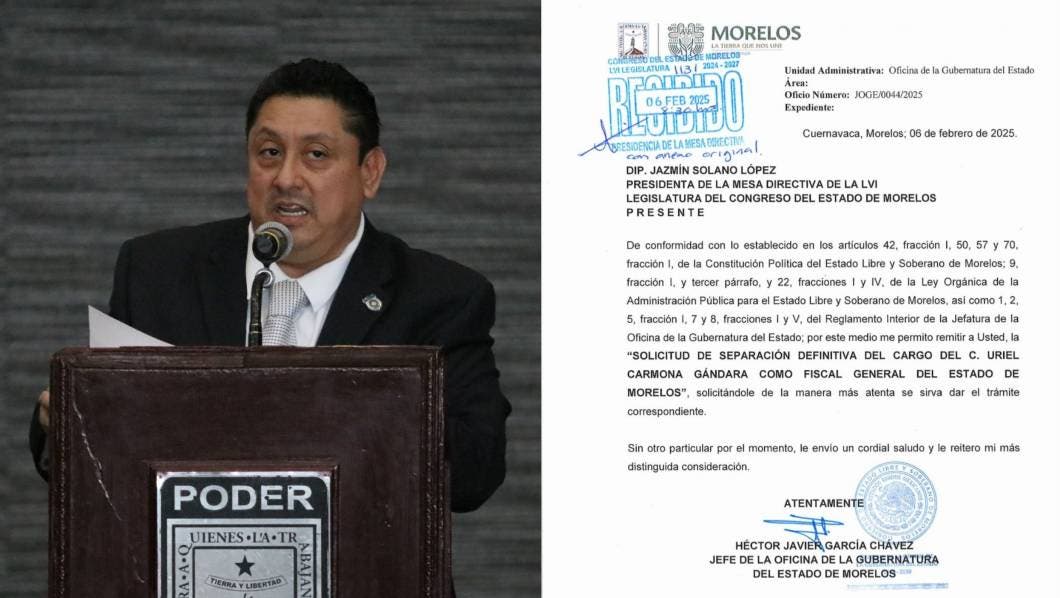 De acuerdo con un documento enviadoa la Mesa Directiva del Congreso, por parte de Héctor Javier García Chávez, jefe de la Oficina de la Gubernatura, se remitió la solicitud de separación definitiva del cargo de Uriel Carmona, como fiscal general de Morelos.