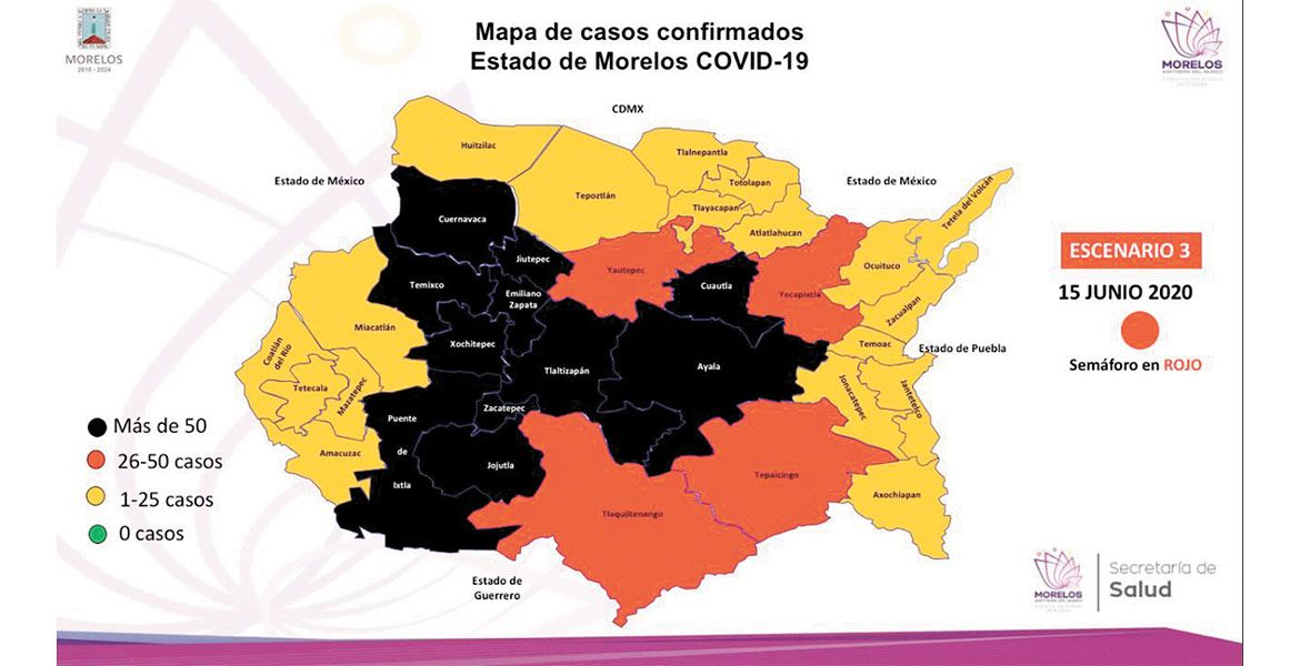 Los municipios con más casos positivos y defunciones son Cuernavaca, Cuautla, Temixco, Jiutepec, Jojutla, Zacatepec, Xoxocotla, Yautepec, Tlaltizapan y Puente de Ixtla.