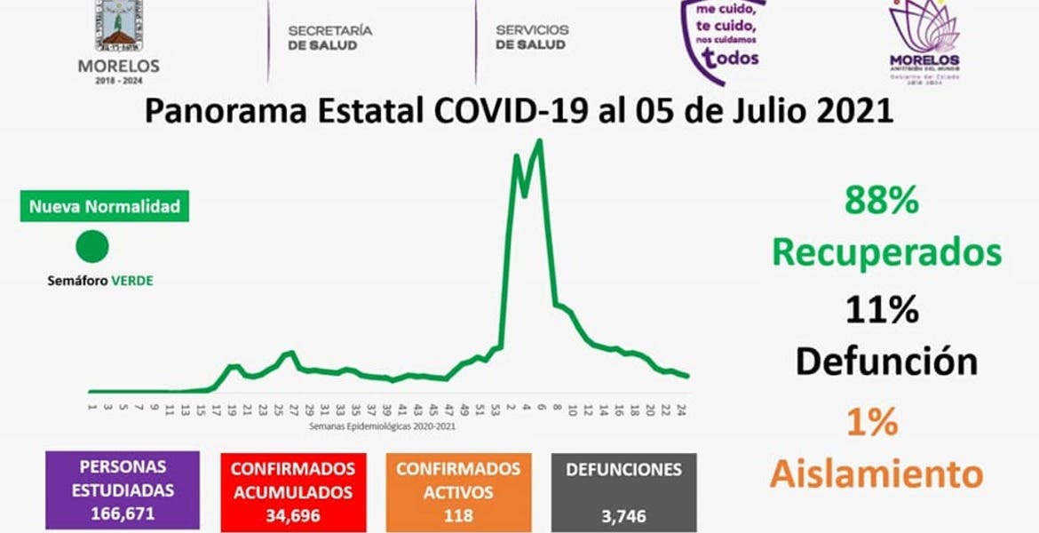 La Secretaría de Salud informa que a la fecha en Morelos se han estudiado 166 mil 671 personas, de las cuales se han confirmado 34 mil 696 con coronavirus COVID-19; 118 están activas y se han registrado 3 mil 746 defunciones.