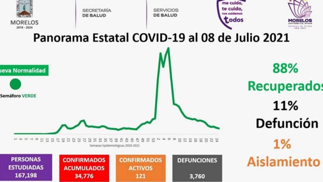La Secretaría de Salud informa que a la fecha en Morelos se han estudiado 167 mil 198 personas, de las cuales se han confirmado 34 mil 776 con coronavirus COVID-19; 121 están activas y se han registrado 3 mil 760 defunciones.
