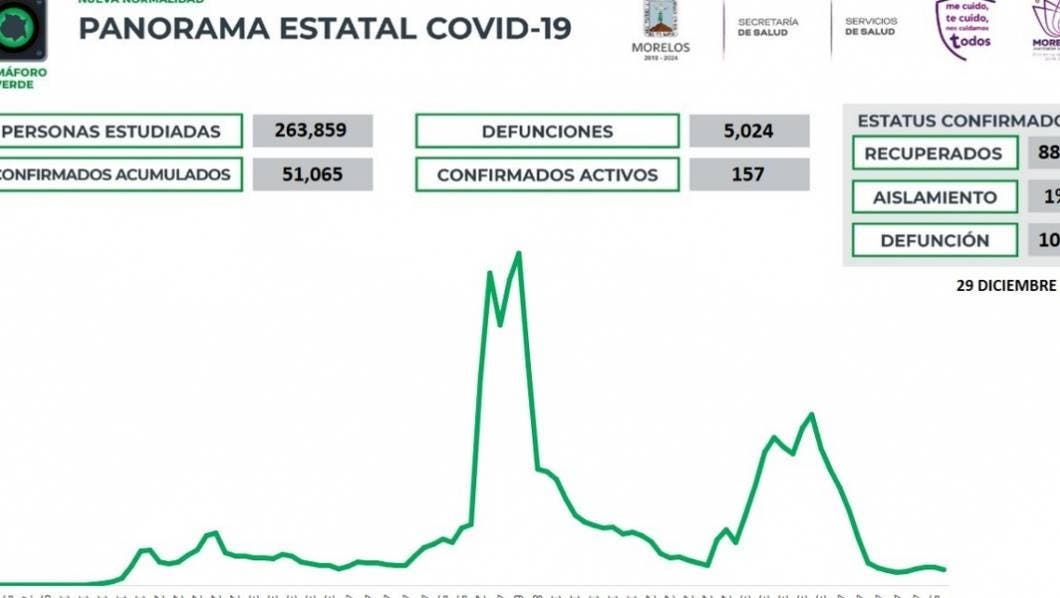La Secretaría de Salud informa que a la fecha en Morelos se han estudiado 263 mil 859 personas, de las cuales se han confirmado 51 mil 065 con coronavirus COVID-19; 157 están activas y se han registrado 5 mil 024 defunciones.