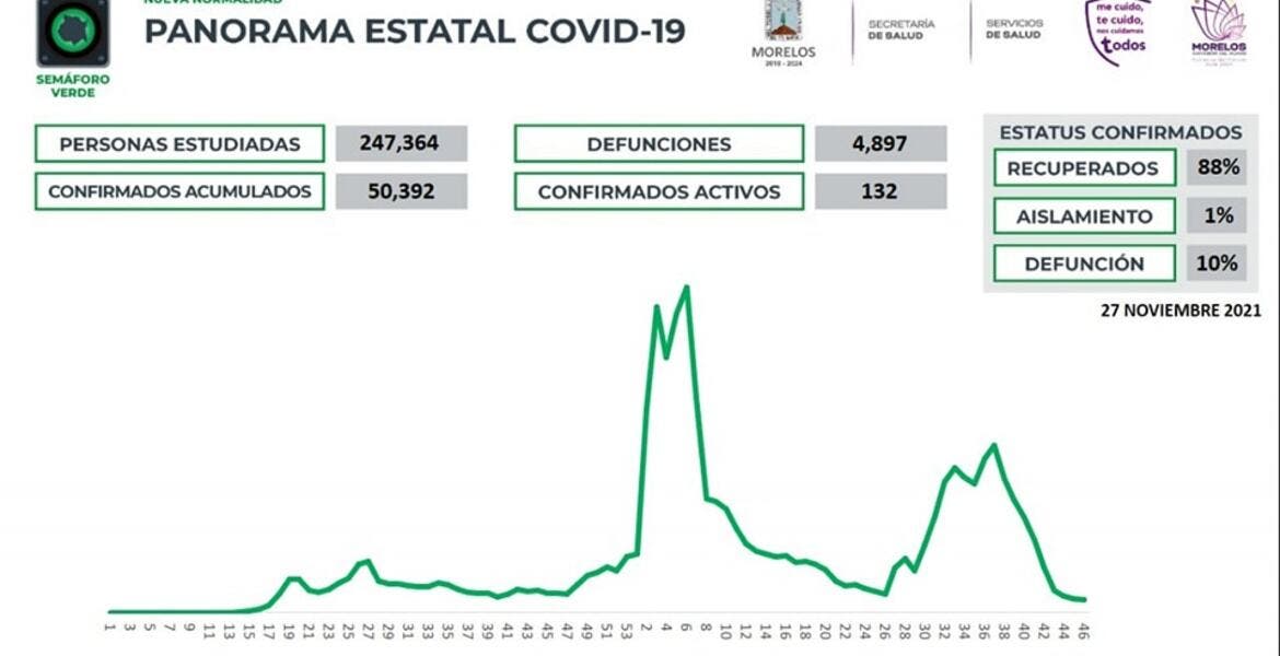 La Secretaría de Salud Morelos informa que a la fecha en Morelos se han estudiado 247 mil 364 personas, de las cuales se han confirmado 50 mil 392 con coronavirus COVID-19; 132 están activas y se han registrado 4 mil 897 defunciones.