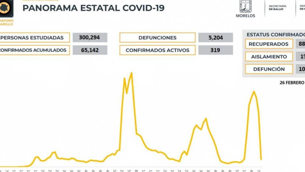 La Secretaría de Salud informa que a la fecha en Morelos se han estudiado 300 mil 294 personas, de las cuales se han confirmado 65 mil 142 con coronavirus COVID-19; 319 están activas y se han registrado 5 mil 204 defunciones.