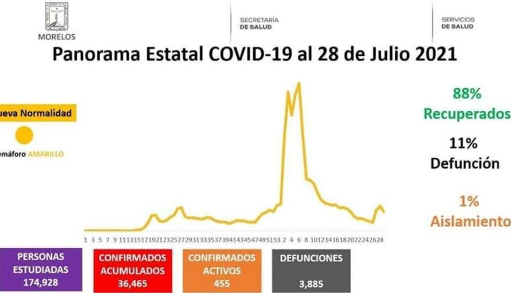La Secretaría de Salud informa que a la fecha en Morelos se han estudiado 174 mil 928 personas, de las cuales se han confirmado 36 mil 465 con coronavirus COVID-19; 455 están activas y se han registrado 3 mil 885 defunciones.
