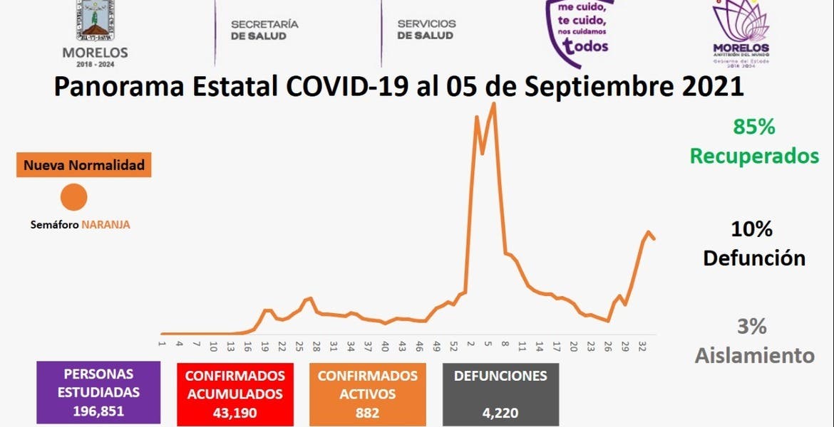 La Secretaría de Salud informa que a la fecha en Morelos se han estudiado 196 mil 851 personas, de las cuales se han confirmado 43 mil 190 con coronavirus COVID-19; 882 están activas y se han registrado 4 mil 220 defunciones.