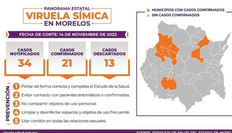 Al corte del lunes 14 de noviembre de 2022, en Morelos se tienen un total de 34 casos estudiados, de este número, 21 confirmados acumulados a la enfermedad, distribuidos en los municipios de Cuernavaca, Cuautla, Jiutepec, Temixco, Emiliano Zapata, Jojutla y Atlatlahucan; así como, 13 que han sido descartados.