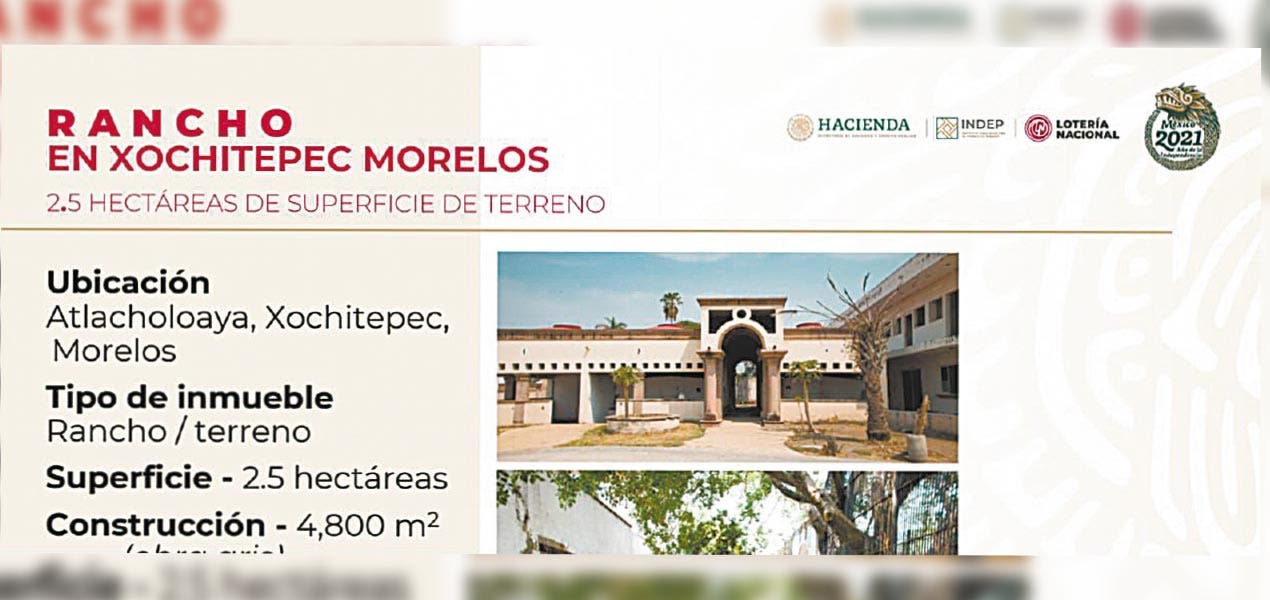 Cuernavaca, MORELOS.- Un rancho ubicado en el poblado de Atlacholoaya, municipio de Xochitepec, será parte de los premios del Gran Sorteo Nacional que se realizará el 15 de septiembre, informó Margarita González Saravia, directora general de la Lotería Nacional.