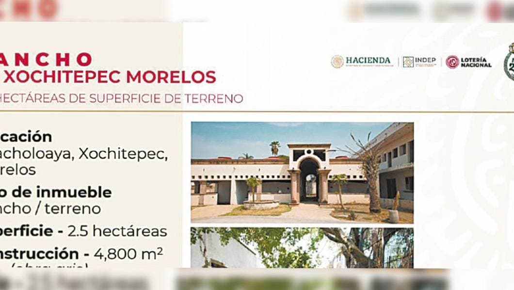 Cuernavaca, MORELOS.- Un rancho ubicado en el poblado de Atlacholoaya, municipio de Xochitepec, será parte de los premios del Gran Sorteo Nacional que se realizará el 15 de septiembre, informó Margarita González Saravia, directora general de la Lotería Nacional.