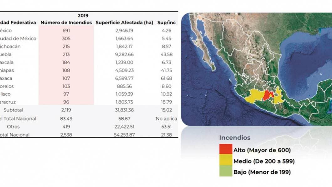 De acuerdo con el reporte nacional de incendios forestales, del 1 de enero al 11 de abril de 2019, el estado pasó del lugar 9 al número 8 por 103 incendios registrados, apenas por debajo de Oaxaca (lugar 7) y Chiapas (lugar 6), que tuvieron 107 y 108.