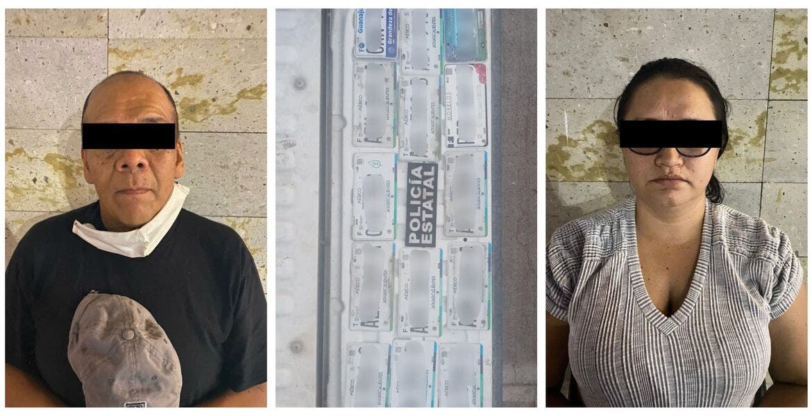 Elementos de la Secretaría de Seguridad Pública de Aguascalientes detuvieron a una mujer colombiana y a un hombre originario de Cuernavaca, dedicados al robo de placas vehiculares, a quienes les fueron aseguradas 14 láminas de distintas entidades, algunas con reporte de robo vigente.