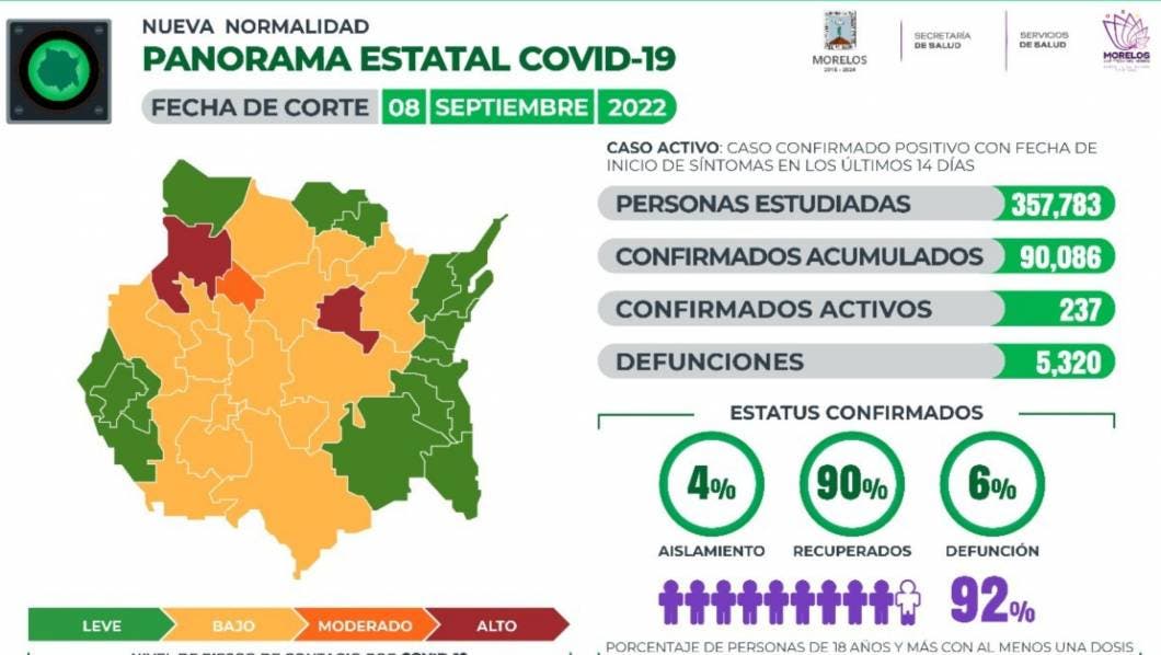 La Secretaría de Salud informa que a la fecha en Morelos se han estudiado 357 mil 783 personas, de las cuales se han confirmado 90 mil 086 con coronavirus COVID-19; 237 están activas y se han registrado 5 mil 320 defunciones.