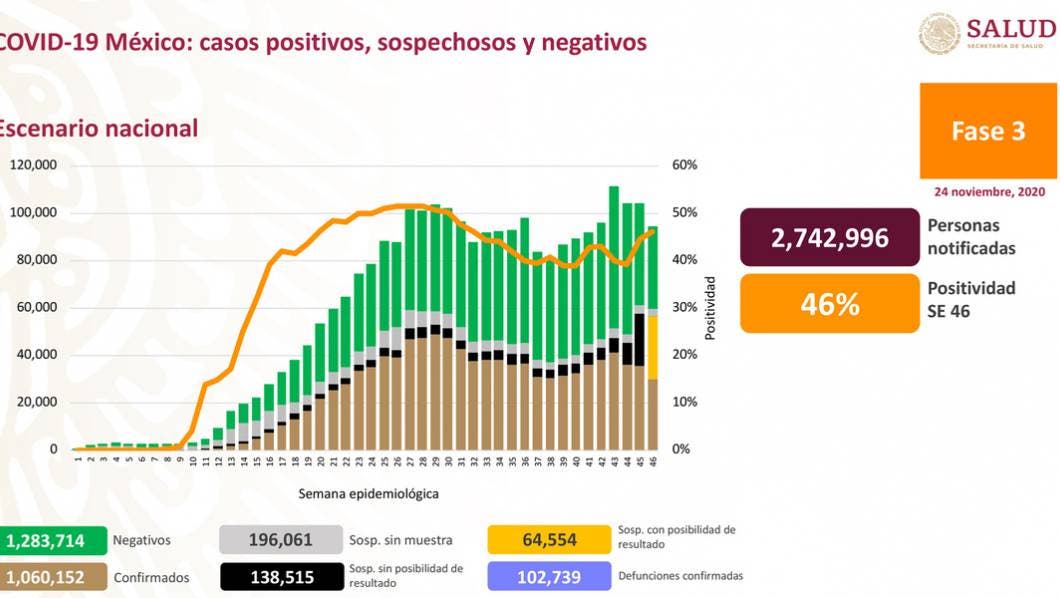 Autoridades de la Secretaría de Salud informaron que el número de muertos por coronavirus covid-19 en México llegó a 102 mil 739, mientras que los casos confirmados alcanzan 1 millón 60 mil 152.