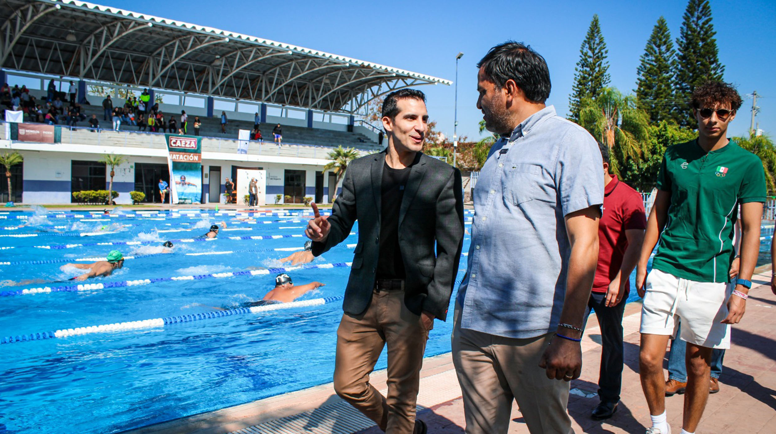 Cuernavaca.- Rommel Pacheco Marrufo, director de la Comisión Nacional de Cultura Física y Deporte (Conade), realizó una visita al Complejo Acuático Emiliano Zapata (Caeza), donde fue recibido por el director del Instituto del Deporte y Cultura Física del Estado de Morelos (Indem), Juan Felipe Domínguez Robles, lo anterior en el marco de la firma del convenio de colaboración entre ambas dependencias.