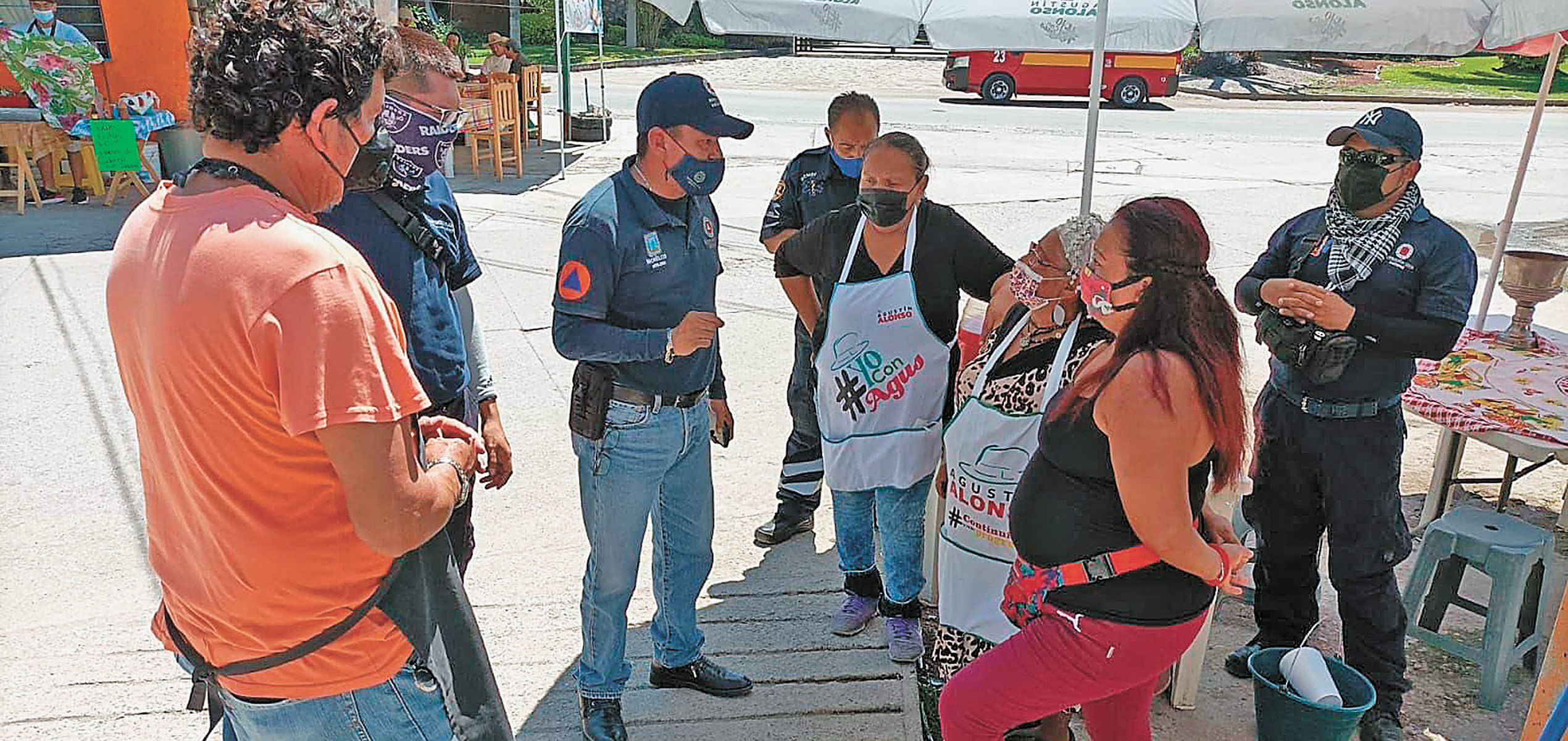 Las autoridades recorrieron el lugar para indicar a los comerciantes y población en general que el uso correcto del cubrebocas es obligatorio, además recordaron la importancia del lavado frecuente de manos con agua y jabón o utilización de alcohol gel al 70 por ciento, así como mantener una distancia mínima de 1.5 metros entre personas y el estornudo de etiqueta.