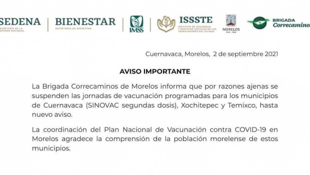 Anoche, autoridades de Salud informaron que se suspendió la vacunación que se tenía programada para este viernes 3 y sábado 4 de septiemnre en Cuernavaca, Xochitepec y Temixco.