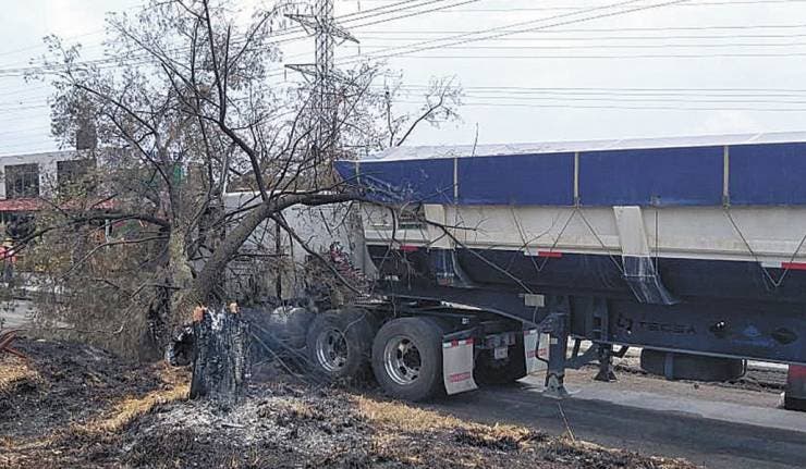 Un tráiler doble remolque fue aplastado por un árbol, tras desplomarse presuntamente luego de que le prendieran fuego en un camellón, justo en el libramiento Oriente, a la altura de las vías de la empresa Campi, en la colonia Cerritos, en Cuautla.