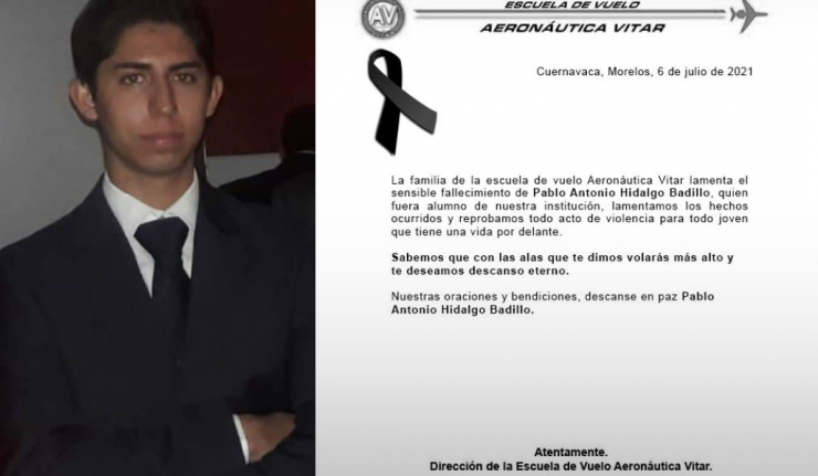De acuerdo con el comunicado, la Escuela de Vuelo Vitar lamenta los hechos en las que perdió la vida el joven Pablo Antonio Hidalgo Badillo, de 24 años de edad, fue alumno de la institución.