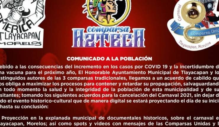 Debido a las consecuencias del incremento en los casos por COVID 19 y la incertidumbre de una vacuna para el próximo año, el Ayuntamiento de Tlayacapan y los autores de las 3 comparsas tradicionales, llegaron a un acuerdo de cabildo que obliga a maximizar los procesos para contener y retardar su propagación, salvaguardando en todo momento la salud y la integridad de la población de esta municipalidad y de sus visitantes.