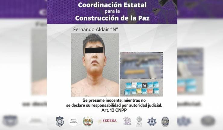 Fueron elementos de la Policía Morelos quienes aseguraron a Fernando Aldair, de 20 años, quien quedó a disposición del Ministerio Público por delitos contra la salud y violación a la Ley Federal de Armas de Fuego y Explosivos.
