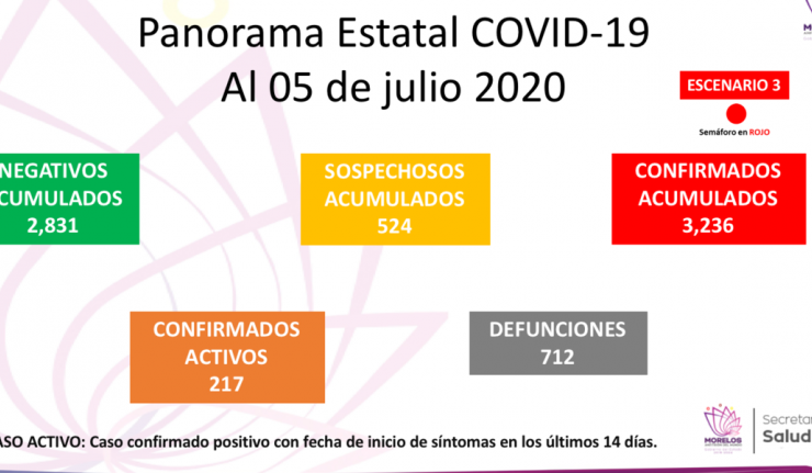 La Secretaría de Salud informa que a la fecha en Morelos se han confirmado tres mil 236 casos de coronavirus COVID-19, 217 activos, descartado dos mil 831 y están como sospechosos 524; se han registrado 712 defunciones.