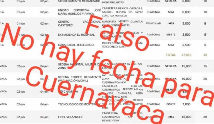 En redes sociales se compartió una captura de pantalla donde se mostraban supuestas sedes de vacunación vs COVID19 para personas de Cuernavaca de 40 a 49 años.
