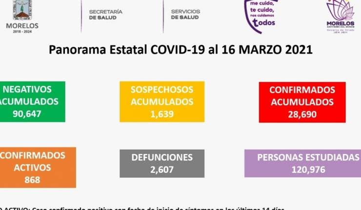 La Secretaría de Salud informa que a la fecha en Morelos se han estudiado 120 mil 976 personas, de las cuales se han confirmado 28 mil 690 con coronavirus COVID-19; 868 están activas, descartado 90 mil 647 y están como sospechosos mil 639; se han registrado 2 mil 607 defunciones.