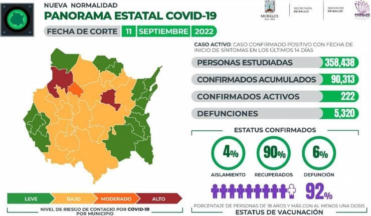La Secretaría de Salud informa que a la fecha en Morelos se han estudiado 358 mil 438 personas, de las cuales se han confirmado 90 mil 313 con coronavirus COVID-19; 222 están activas y se han registrado 5 mil 320 defunciones.