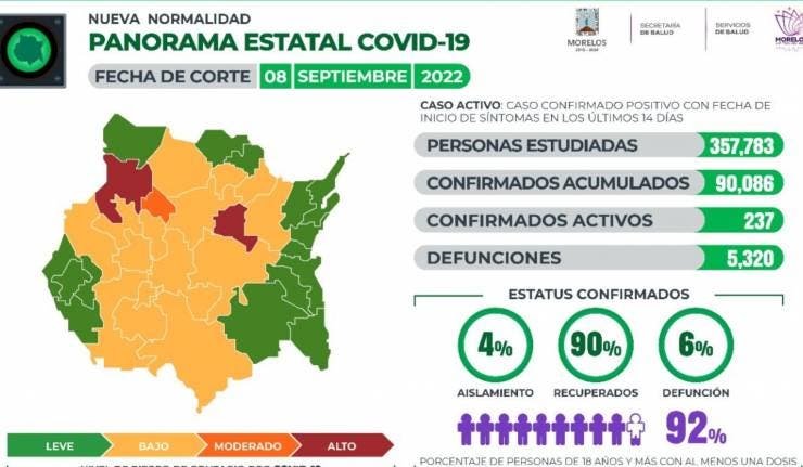 La Secretaría de Salud informa que a la fecha en Morelos se han estudiado 357 mil 783 personas, de las cuales se han confirmado 90 mil 086 con coronavirus COVID-19; 237 están activas y se han registrado 5 mil 320 defunciones.