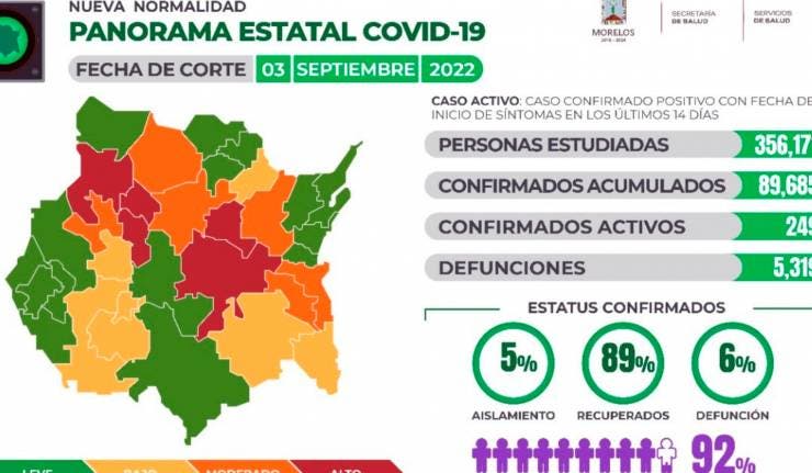 La Secretaría de Salud informa que a la fecha en Morelos se han estudiado 356 mil 171 personas, de las cuales se han confirmado 89 mil 685 con coronavirus COVID-19; 249 están activas y se han registrado 5 mil 319 defunciones.